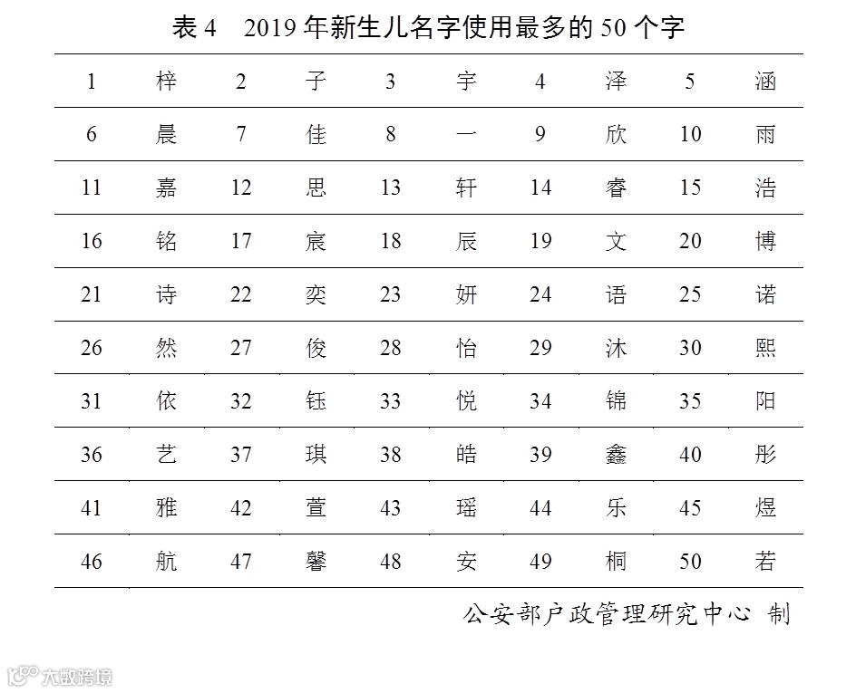 2019年出生并已经进行户籍登记的新生儿名字中,使用频率最高的50个字依次为“梓”“子”“宇”“泽”“涵”“晨”“佳” “一”“欣”“雨”等。与2018年相比,“锦”“瑶”“煜”“安”等字新晋成为新生儿起名用字首选。