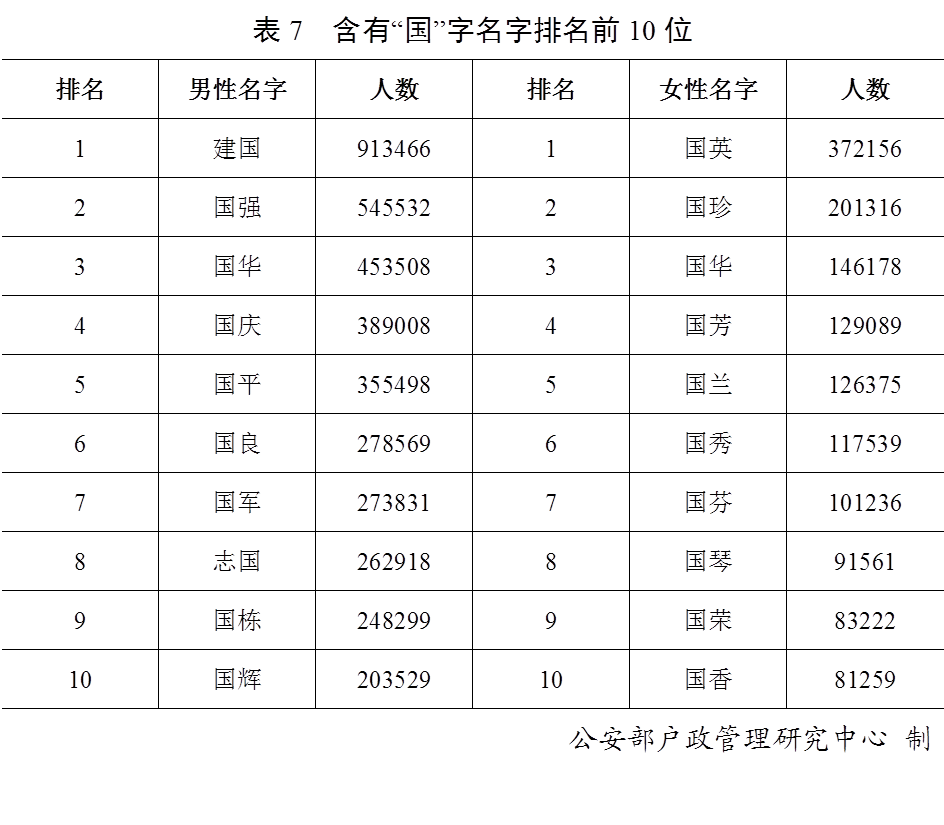 2019年是新中国成立70周年。一直以来,很多人取名喜欢用“国”字,寄寓着深厚的家国情怀。取名为“国庆”“国强”“建国”“国英”“国华”等的“国”人们,有的因为与共和国同龄,有的因为出生在国庆节,有的为了表达对祖国的美好祝愿。截至2019年12月31日,全国户籍人口名字中含有“国”字的共计2127.9万人,其中男性1769.3万人,女性358.6万人,男性人数是女性近5倍。从名字使用频率看,排名前10位的男性“国”人名字依次为“建国”“国强”“国华”“国庆”“国平”“国良”“国军”“志国”“国栋”“国辉”,排名前10位的女性“国”人名字依次为“国英”“国珍”“国华”“国芳”“国兰”“国秀”“国芬”“国琴”“国荣”“国香”。