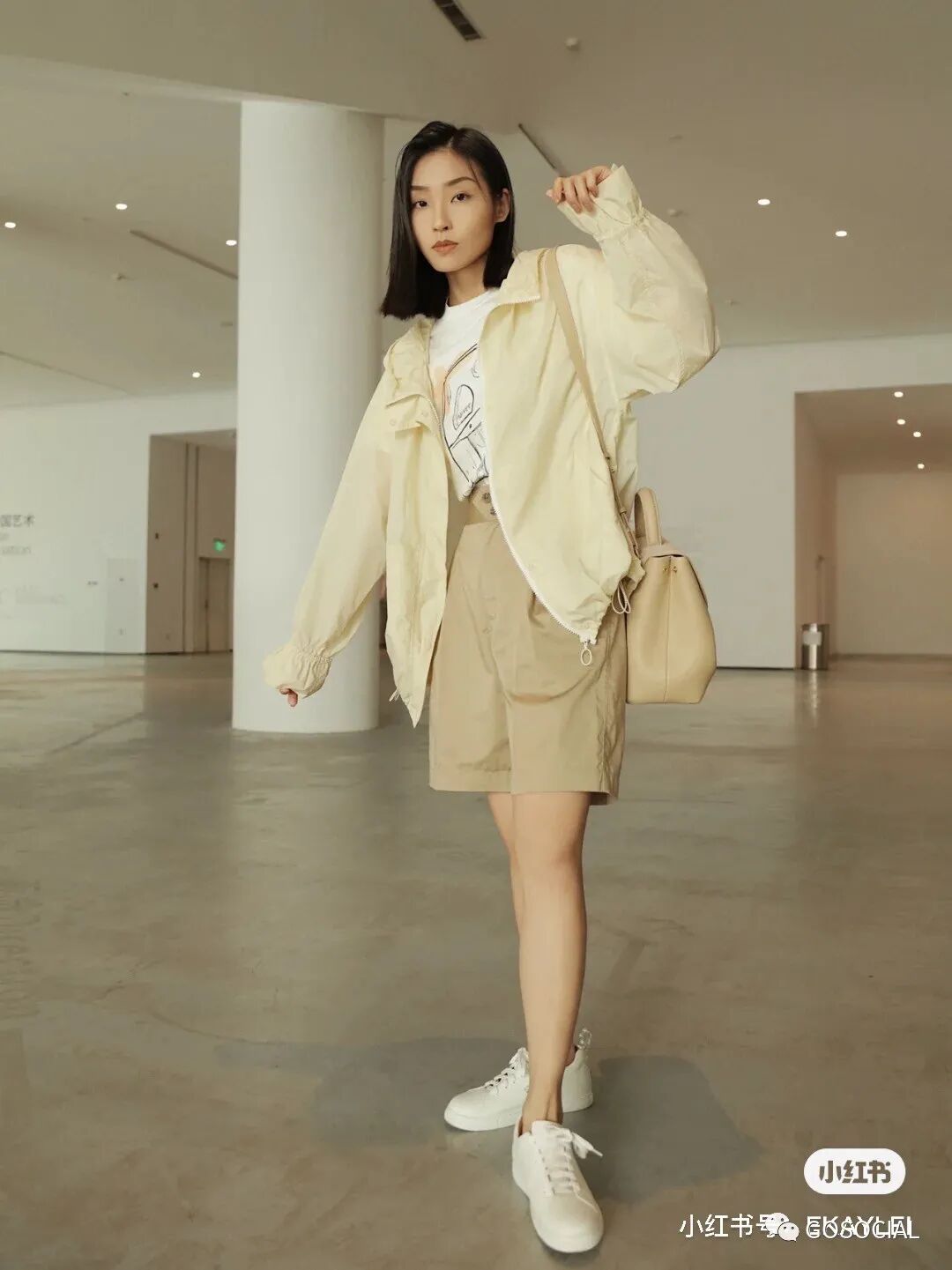 但她也有青春活力的一面。奶油黄外套内搭涂鸦T恤,灵动又可爱。就像夏日的柠檬气泡水,清新舒爽。下身工装短裤的搭配,又为整个look增加不少cool值。