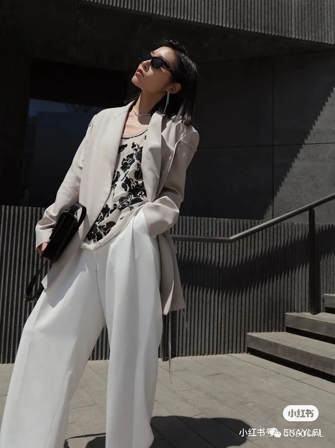 淡淡的卡其灰搭配白色西装裤,用珍珠项链和耳环精心装饰,巧妙地诠释了女性冷艳优雅的气场。