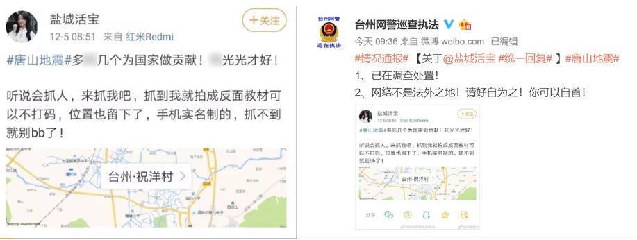 2、网友发唐山地震不当言论,3小时被抓 5日早上,河北唐山发生4.5级地震,一名ID为“盐城活宝”的网友对此发布了不当言论,称“抓到我就拍成反面教材”。浙江台州警方迅速反应,进行调查处置。不到3小时,就将涉事人抓获。(@台州网警巡查执法)