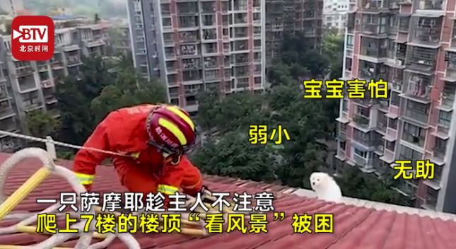 3、萨摩耶犬爬7楼顶“看风景”被困 3日,四川内江一只萨摩耶犬趁主人不注意,爬上楼顶“看风景”被困。消防员取来软梯爬上屋顶将它抱起,脱困的萨摩耶犬迅速挣脱消防员的怀抱,狂奔下屋顶。消防员事后表示当时被吓坏了,怕狗再滑下来。(@时间视频)