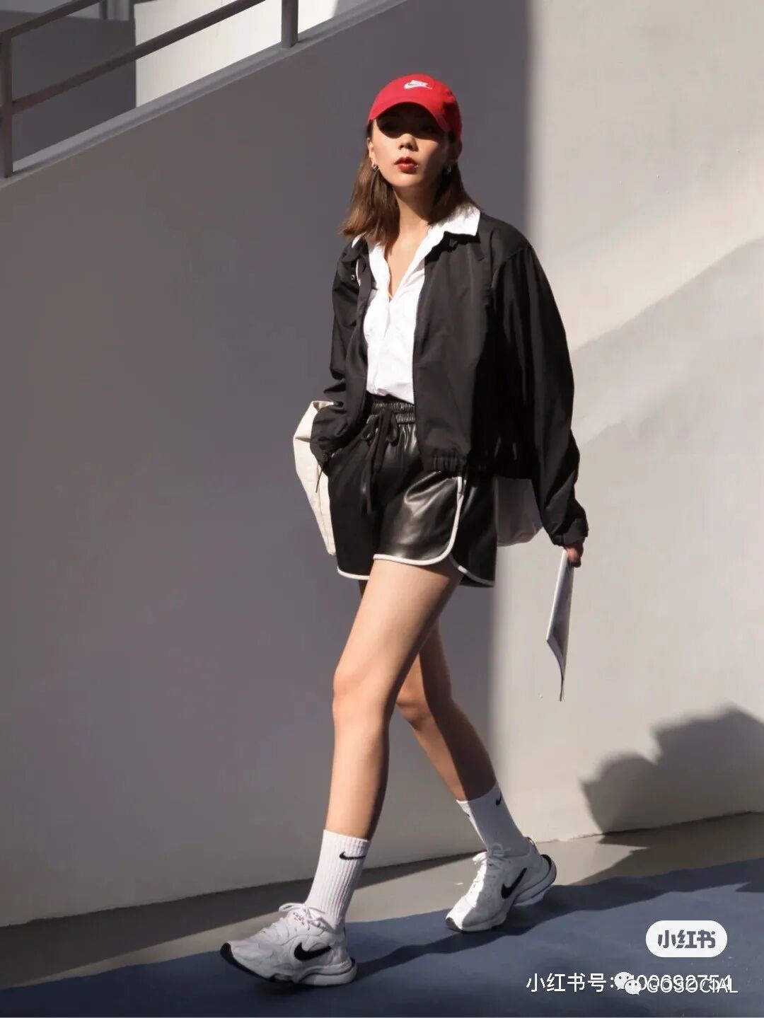 白衬衫黑夹克组合加上棒球短裤,再戴上棒球帽,就很是复古时髦。