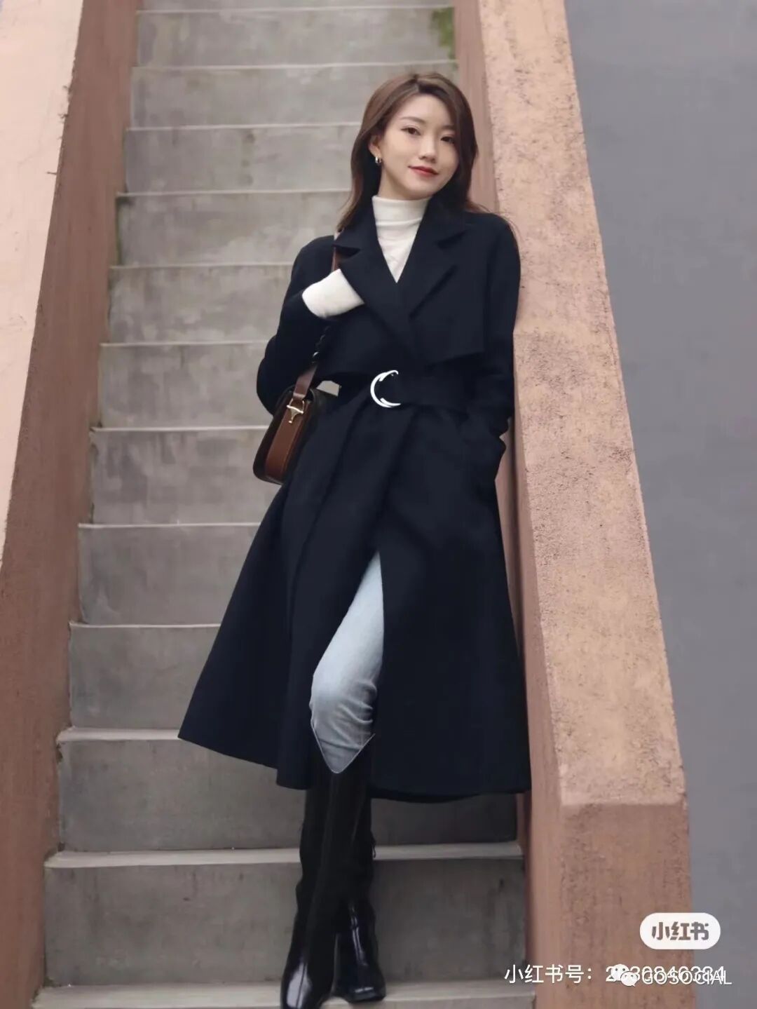 黑色大衣内搭白色高领毛衣,营造层次感;修身牛仔裤搭配长靴,干净又利落。时尚博主uu胡先生的搭配总是简约中透露出温柔气息。