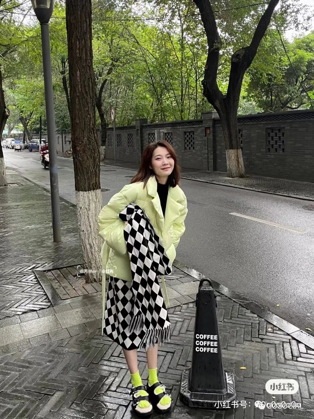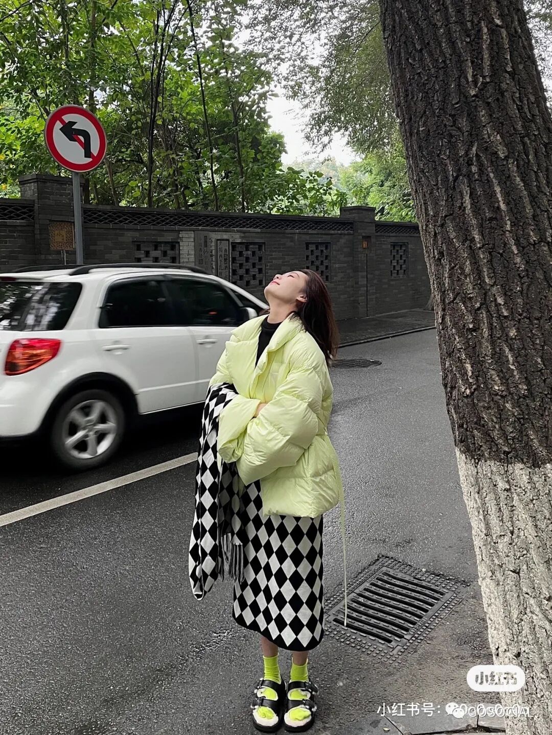 时尚博主芮林er一身亮色系羽绒服搭配时下火热的棋盘格单品,好看又吸睛。笑起来更是充满了古灵精怪的少女气息。
