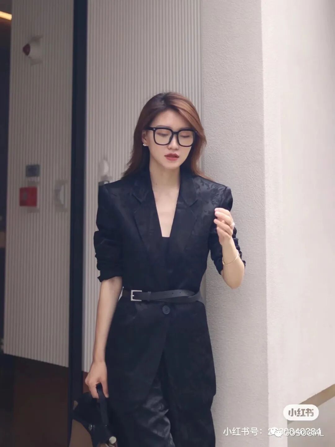 飞机肩版型的西装外套,自然修饰肩线;搭配同色系腰带,为整体造型增添了看点。黑框眼镜,斯文又酷飒。