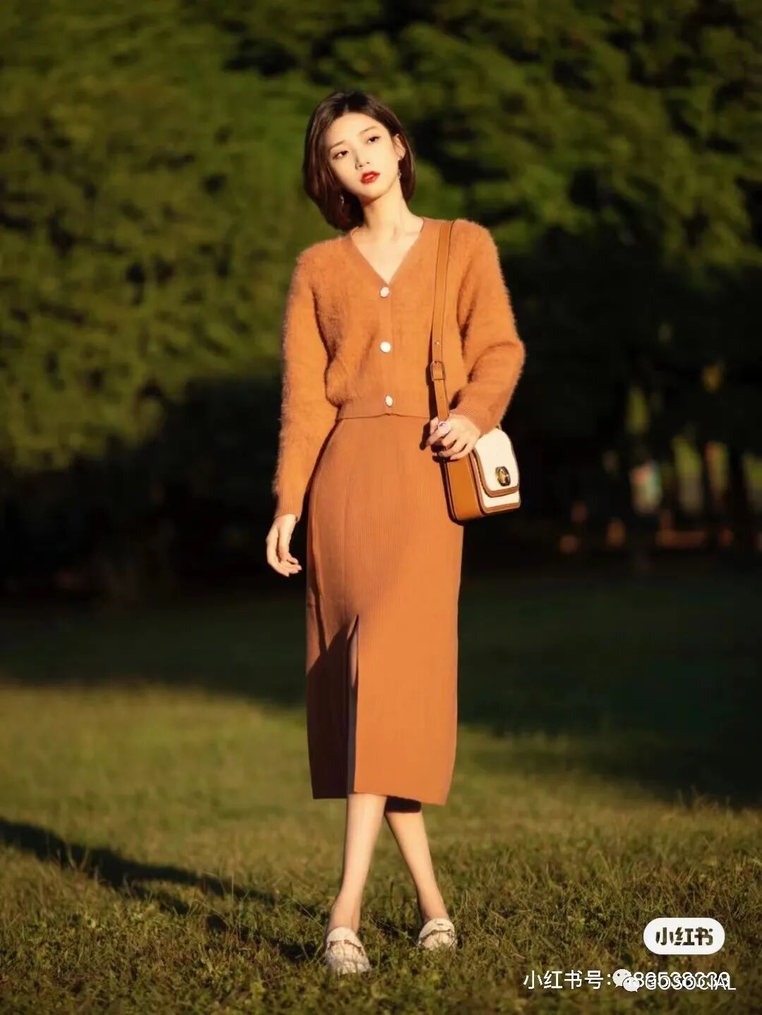红棕色毛衣搭配开衩半身裙,温柔又优雅。时尚博主小时黯的身上总是有一股令人不可忽视的优雅魅力。