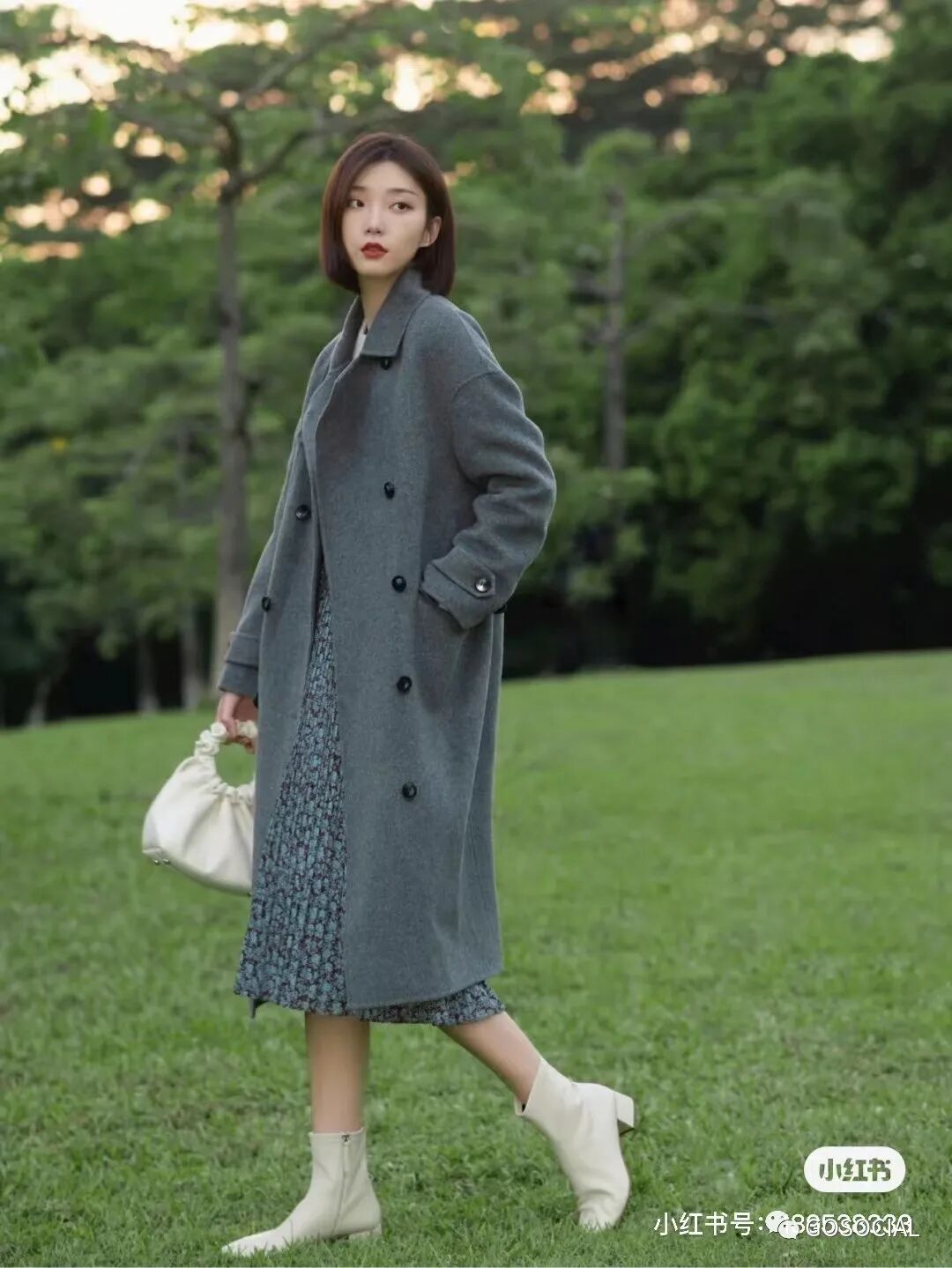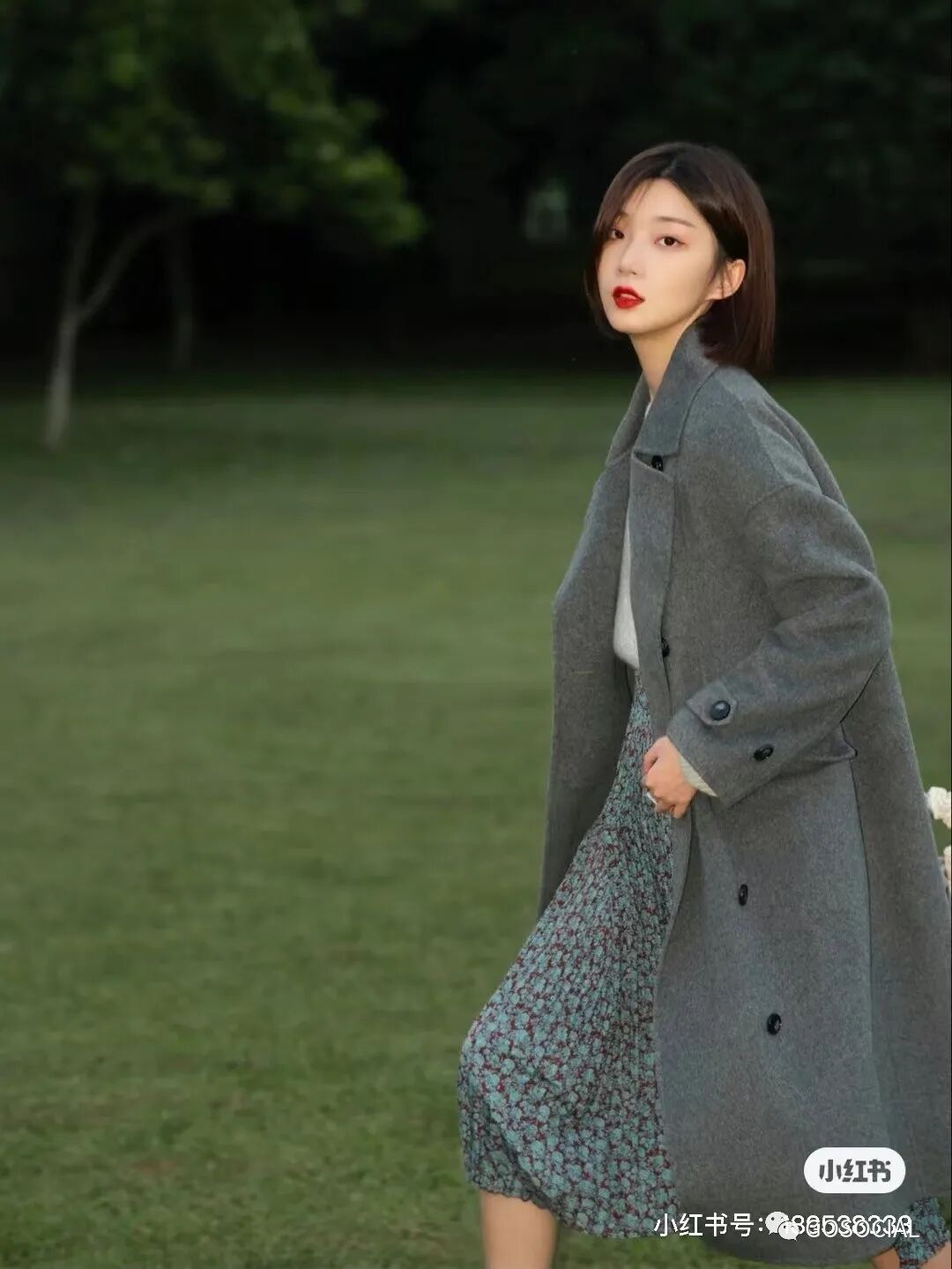 浅灰色毛衣搭配碎花半身裙,再搭配双排扣西装大衣,在秋日黄昏下,尽显身上的知性气质。