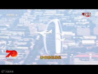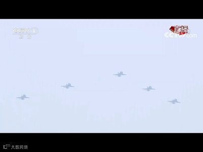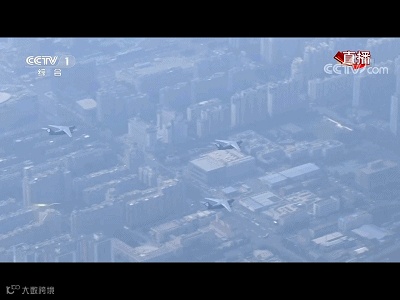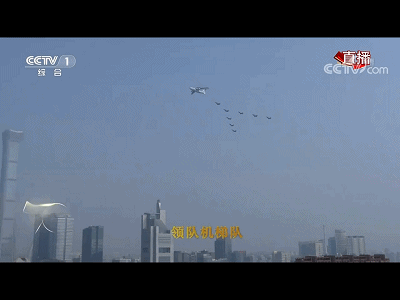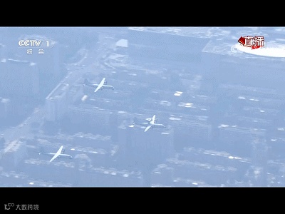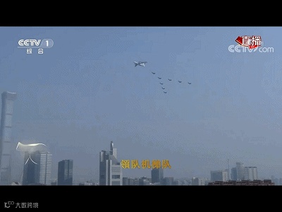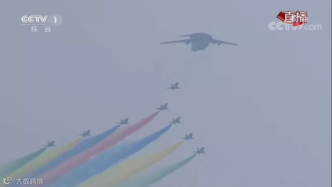 空警-2000预警机自2009年国庆60周年阅兵首次亮相以来,已是第4次接受检阅。由空军八一飞行表演队驾驶的8架歼-10飞机组成箭队护卫两翼,拉出红、黄、蓝、绿4种颜色的7道彩烟为后续梯队铺出华丽的航路。
