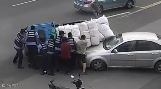 2、三轮货车侧翻司机被困 民警路人合力抬车 11日下午,江苏苏州张家港市包基卡口前,一小轿车与电动三轮车相撞,三轮车翻倒。执勤民警辅警闻声赶来,很快也有热心路人加入,大约只用了一分钟,满载的三轮车被扶起,司机被安全救出。(@时间视频)