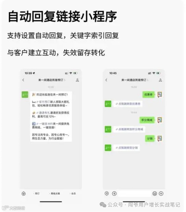 • 自动回复:设置欢迎语、关键词回复,支持跳转小程序及外部链接。