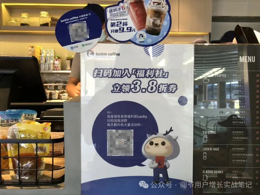 瑞幸咖啡店在收银台旁边设置了一个带有二维码的立牌,顾客在等待咖啡时可以扫描加入品牌的微信客户群,享受会员专属的优惠活动和新品信息。