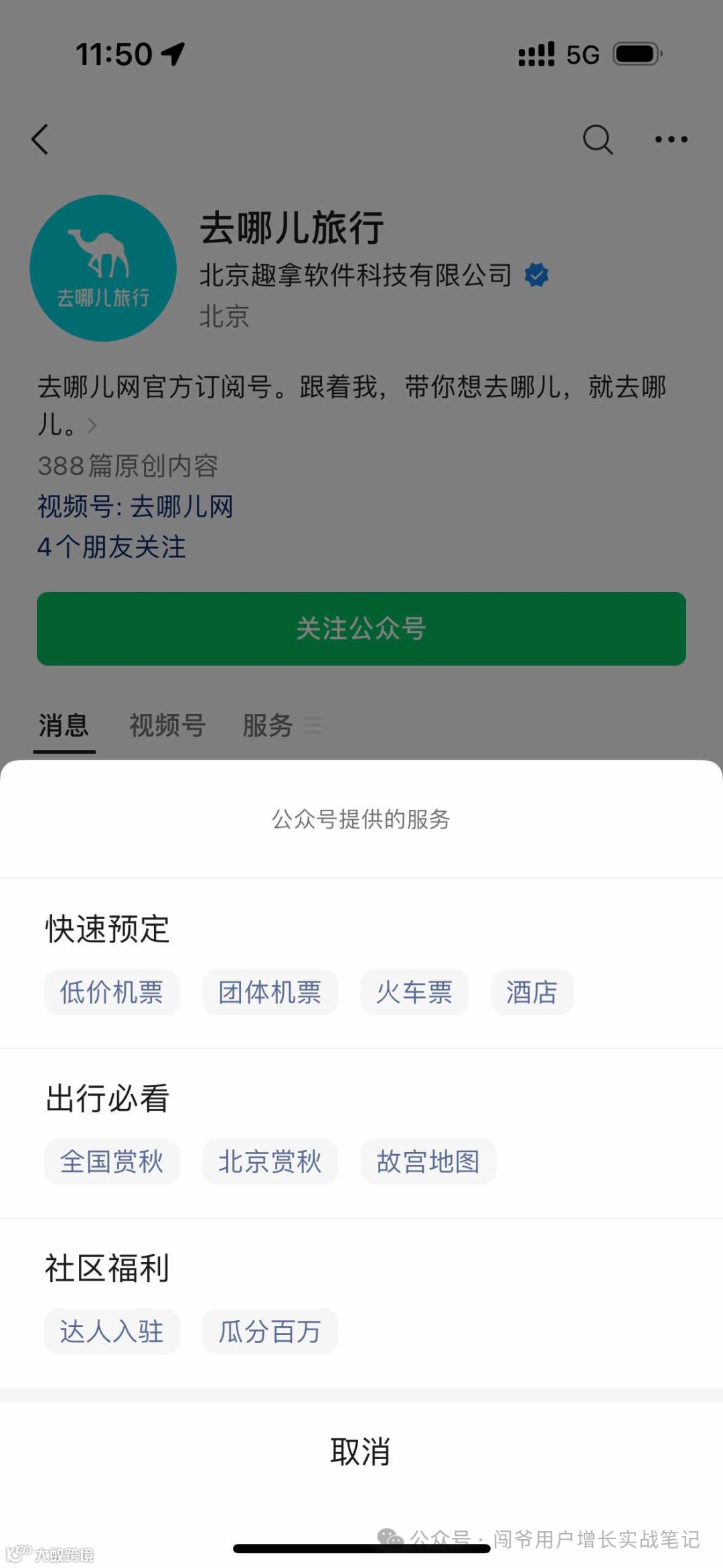 • 案例:旅游公司“去哪儿”通过公众号发布旅游攻略,并在文章底部放置小程序链接,用户点击即可进入预订旅游产品的页面。