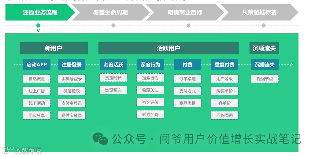 标签体系建立步骤一:完善的标记系统的基本步骤之一是详尽地覆盖用户的整个操作过程,对所有涉及到的行为进行深入挖掘并详细分析其各个维度,最终我们将构建出一种准确而全面的【用户偏好】评估模型。
