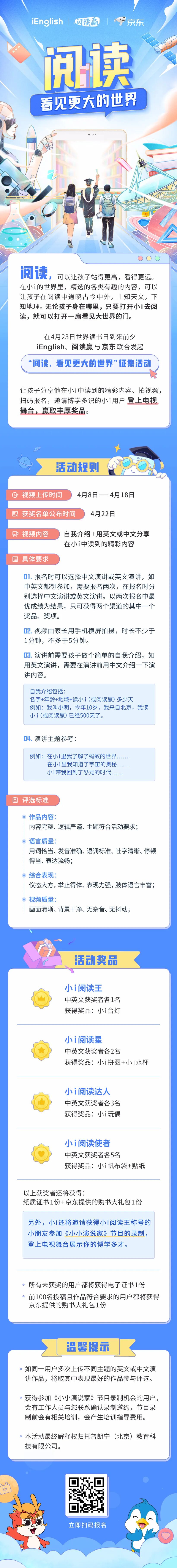 孩子只需要以视频的形式分享ta在小i中读到的精彩内容,就有机会赢取iEnglish和京东联合送出的丰厚奖品,还有机会上电视哦!