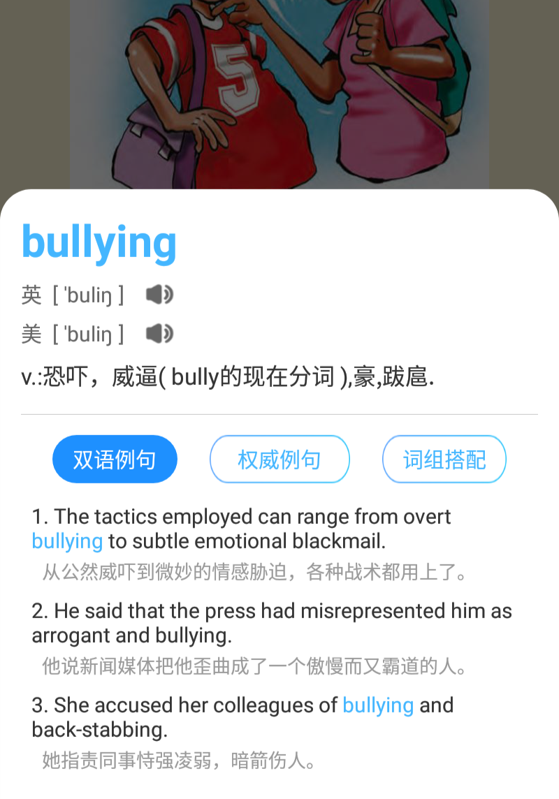 在书籍板块阅读时,遇到不认识的单词可以直接点击,Pad端会展示发音、中文释义、双语例句、权威例句和词组搭配,帮助孩子全方位了解这个单词。