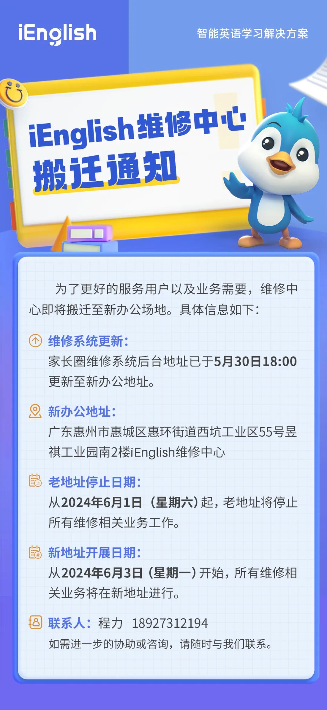 为了更好的服务用户以及业务需要,维修中心即将搬迁至新办公场地。以下是搬迁的具体信息,烦请知悉并相互转告。