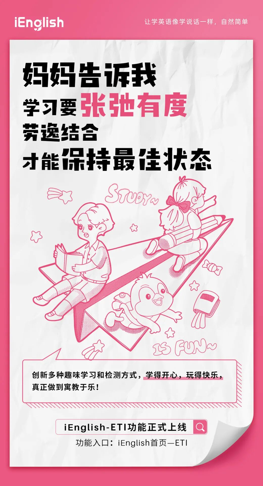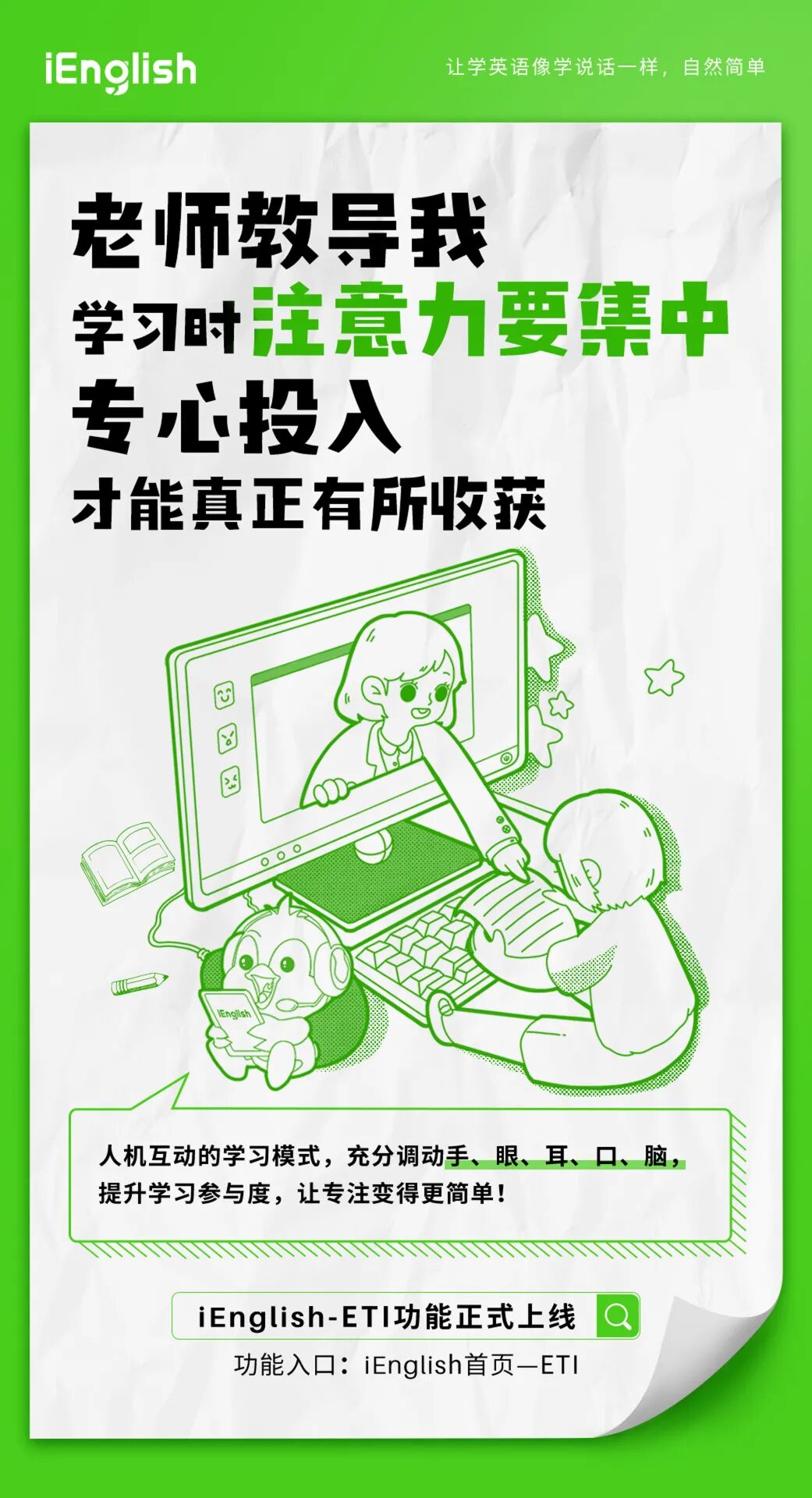 为帮助孩子养成良好学习习惯,iEnglish不断上线新功能来满足孩子在不同场景下的学习使用。以多元视角塑造孩子的文化理解力,培养英语应用和自主学习能力,iEnglish目前人机互动最全面、知识模块最精细化的功能——ETI正式上线啦!
