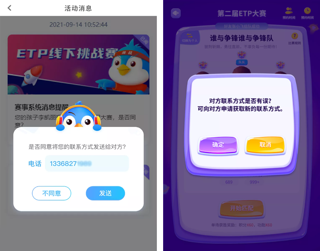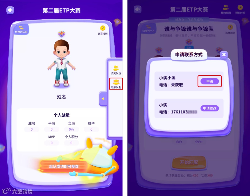 Step 1:ETP比赛界面,点击右侧菜单栏中的「联系队友」,可申请联系方式;