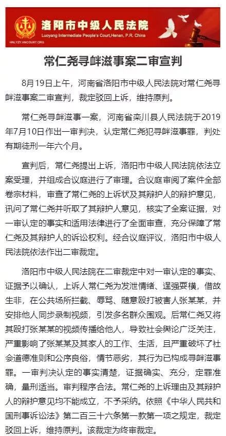 8月19日上午,河南省洛阳市中级人民法院对常仁尧寻衅滋事案二审宣判,裁定驳回上诉,维持原判。