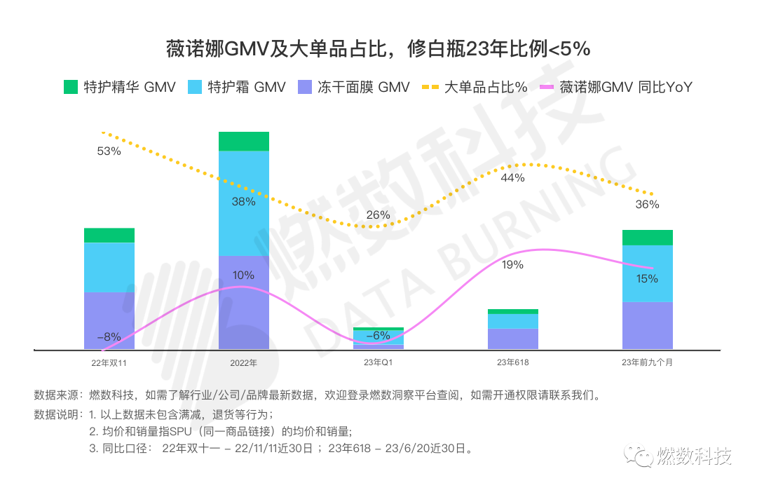 面部护肤:今年整体折扣力度相对去年降低,但双11预热来看,国货品牌合作超头比例进一步增加,但价格竞争加剧,多产品价格同环比下降。