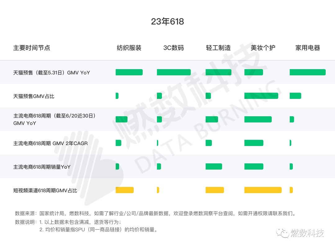 23年618周期(23/6/20近30日)恢复显著,美妆个护、食品饮料、家具家装、纺织服装增速提升靠前。