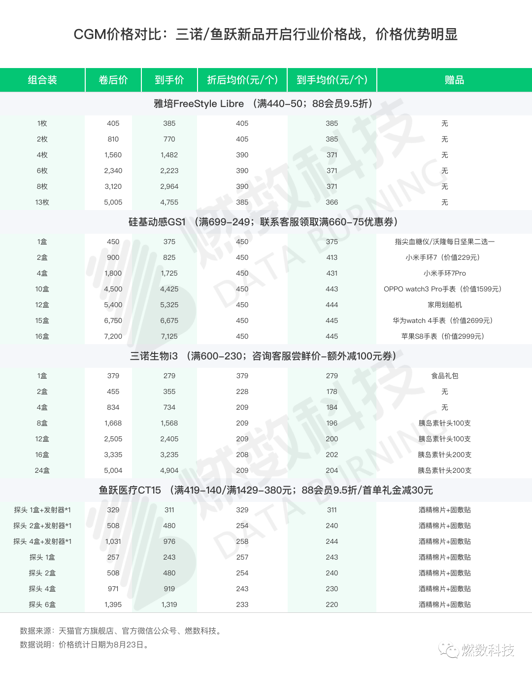 选取8月23日为统计日,以4盒装为例,三诺生物到手价格为734元,鱼跃为976元;而雅培和硅基动感分别为1482元/1725元。硅基动感虽然赠品价值较高,但价格仍相对较高;而三诺生物单个到手均价已破200元,价格不到硅基动感的5成。