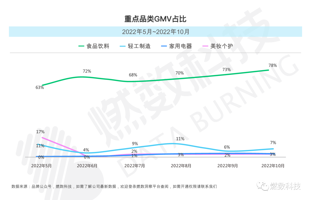 10月,东方甄选直播间食品饮料类GMV继续抬升,占比高达78%;轻工制造、家用电器及美妆个护三大品类GMV占比较9月略有抬升,但占比仍然偏低。