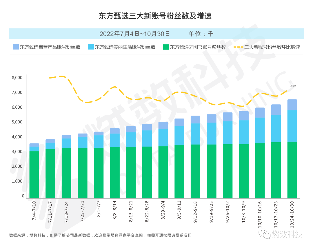 东方甄选主账号粉丝数月环比增长4%。“东方甄选美丽生活”粉丝数增长较快;四大账号累计粉丝数月环比增长6%。