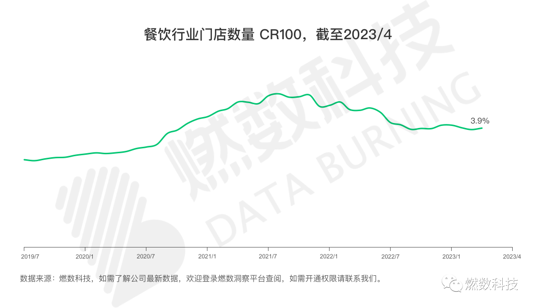 2023年4月,餐饮行业门店数量CR100为3.9%,较疫情前提升;