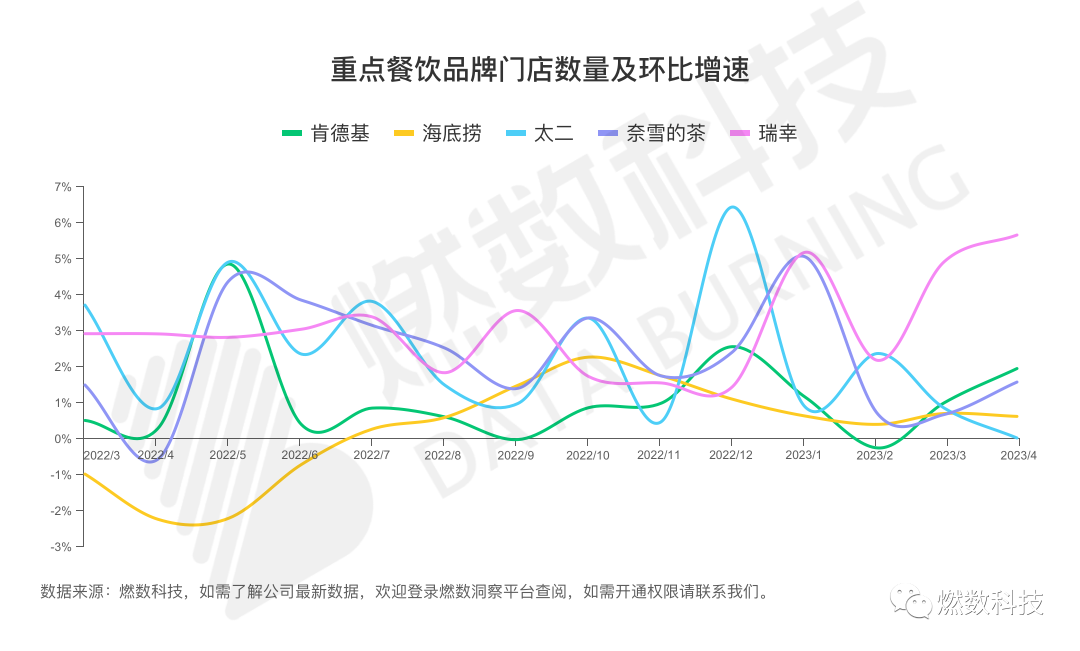 截至2023年4月,肯德基/海底捞/太二/奈雪的茶/瑞幸 运营门店数量分别为 9,474家/1,335家/482家/1,112家/9,717家,分别环比增长2%/1%/0%/2%/6%。