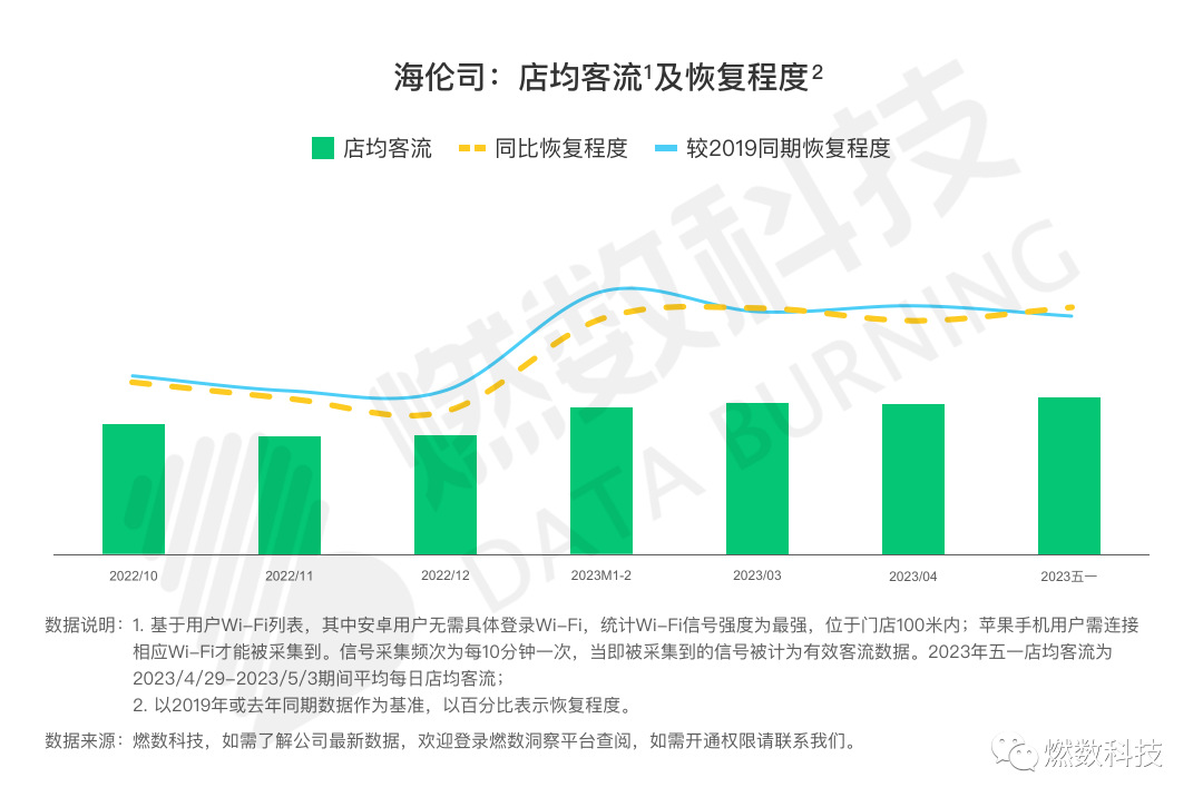 头部餐饮五一店均客流均已超过去年同期水平,海伦司较2019年同期恢复程度领先
