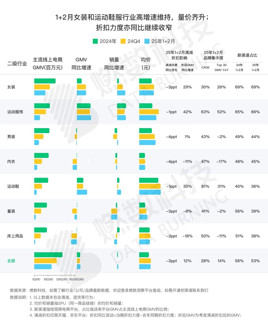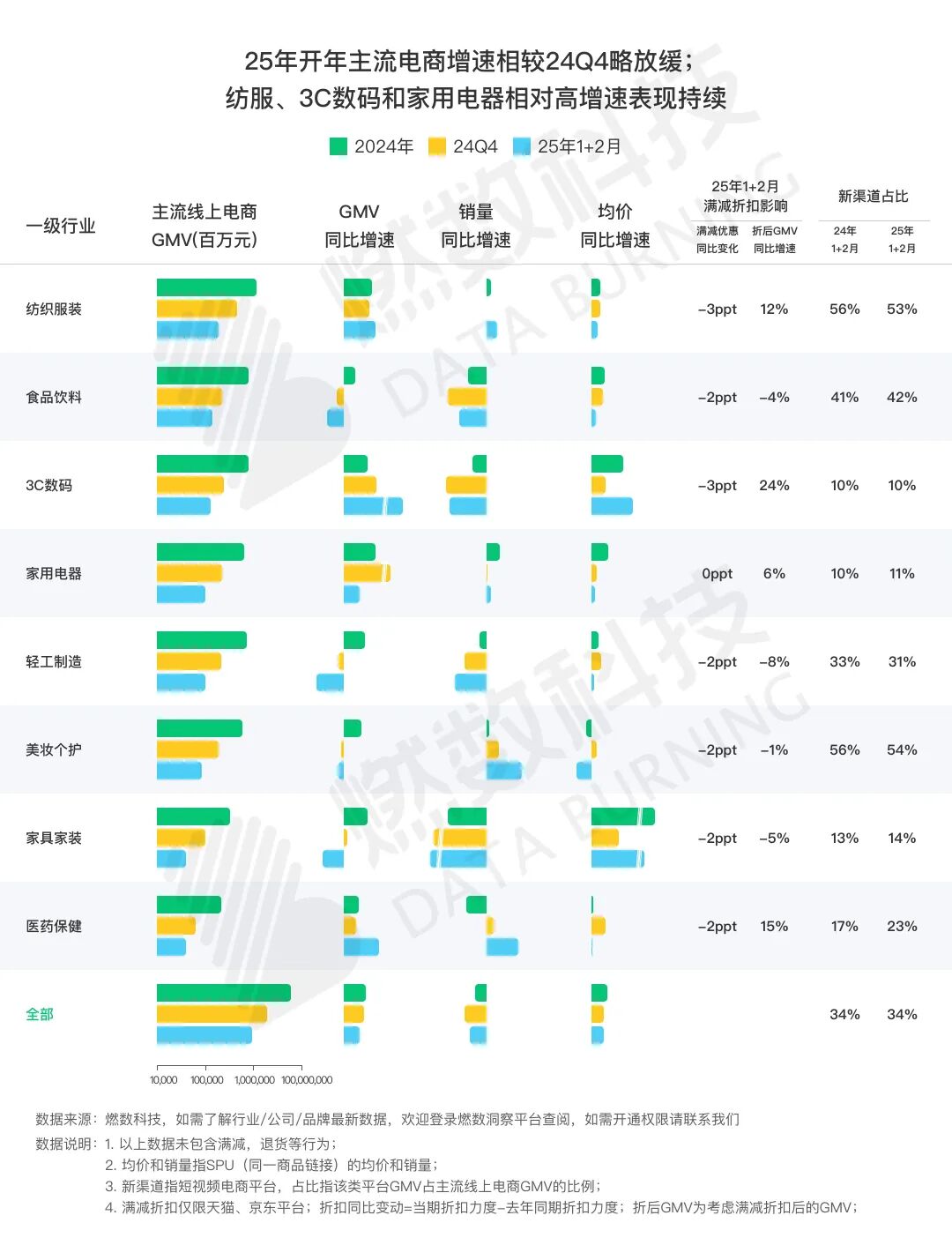 总体表现:25年开年燃数所跟踪的主流电商平台增速相较24Q4略有放缓,但呈现前低后高的趋势,并延续到3月份。纺织服装行业增速稳定维持,3C数码受益于国补25年增速超24Q4,家用电器各品类增速持续跑赢其他子行业,食品饮料节后表现明显好于节前。