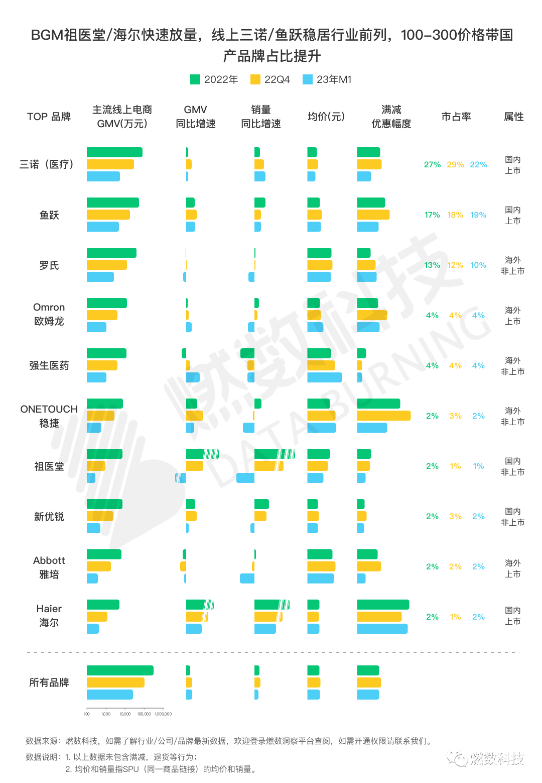 BGM祖医堂/海尔快速放量,线上三诺/鱼跃稳居行业前列,100-300价格带国产品牌占比提升