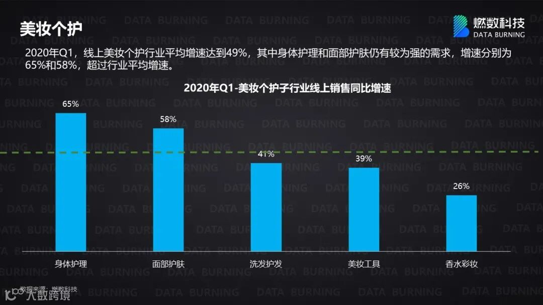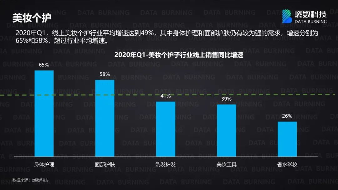 2020年Q1线上消费各行业分化明显,医药保健、美妆个护、食品饮料这三个品类表现靠前,同比增速都超过40%,而线上消费行业整体增速为13%左右。
