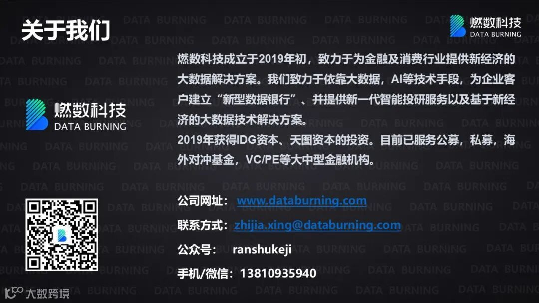 燃数科技成立于2019年初,致力于为金融及消费行业提供新经济的大数据解决方案。我们致力于依靠大数据,AI等技术手段,为企业客户建立“新型数据银行”、并提供新一代智能投研服务以及基于新经济的大数据技术解决方案。2019年获得知名机构投资。目前已服务公募,私募,海外对冲基金,VC/PE等大中型金融机构。