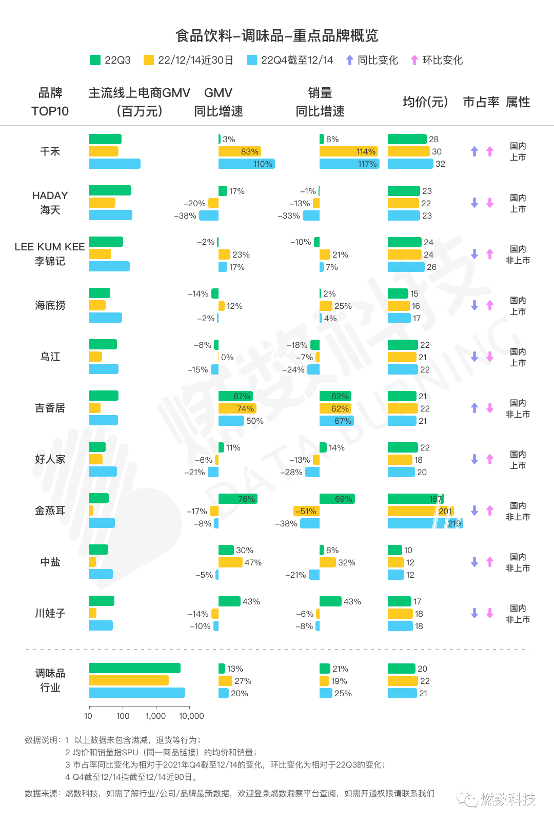 因海天添加剂事件,头部品牌表现分化。千禾持续受益,零添加酱油热卖的同时,借力推广醋/料酒产品,22Q4截至12/14 GMV录得翻倍增长,市占率环比提升3pct至5%;定位高端调味品的李锦记转负为正,录得17%高增长,大单品薄盐生抽、蚝油在大促期间均有不俗表现。海天则因负面舆情,Q4增速急转而下。