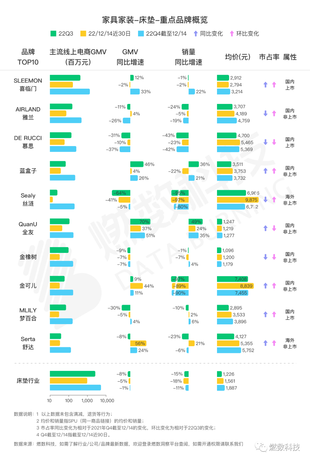知名品牌雅兰、慕思则表现相对疲软,同比增速分别为-26%、-37%,并且增速都较22Q3进一步下滑;蓝盒子则实现26%的同比增速。