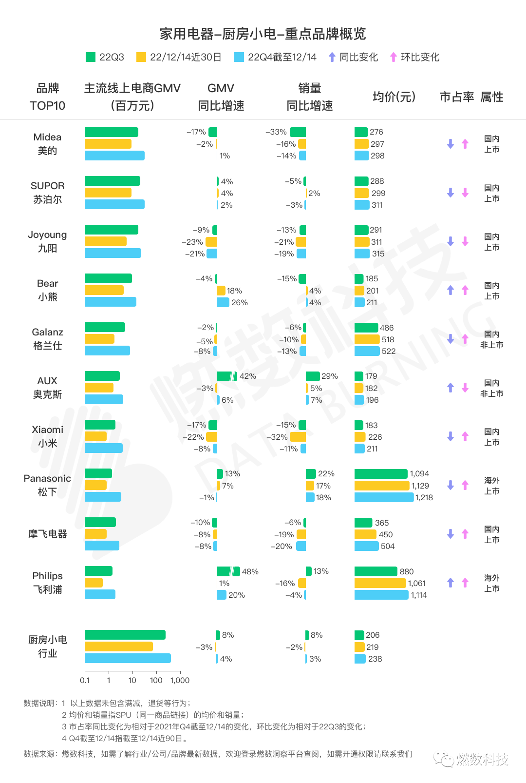 22Q4截至12月14日,厨房小电行业线上GMV同比增4%,较22Q3下滑4pct。细分品类表现分化,其中空气炸锅近期需求放缓,GMV同比降1%;咖啡机渗透率逐渐提升,GMV同比增43%。