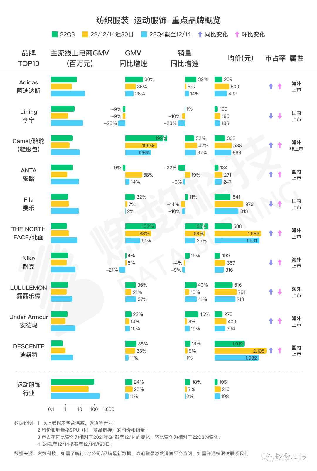 22Q4截至12/14,运动服饰行业GMV同比增长11%;随着天气转冷,各品牌纷纷上新冬季服饰,阿迪达斯推出多款运动羽绒服、加绒加厚运动裤等,同比增长28%;骆驼、北面旗下皆有冲锋衣品类成为爆品,推动品牌分别实现126%、51%的同比增速;Lululemon则是瑜伽裤稳健+羽绒新品发力,增速维持在37%。