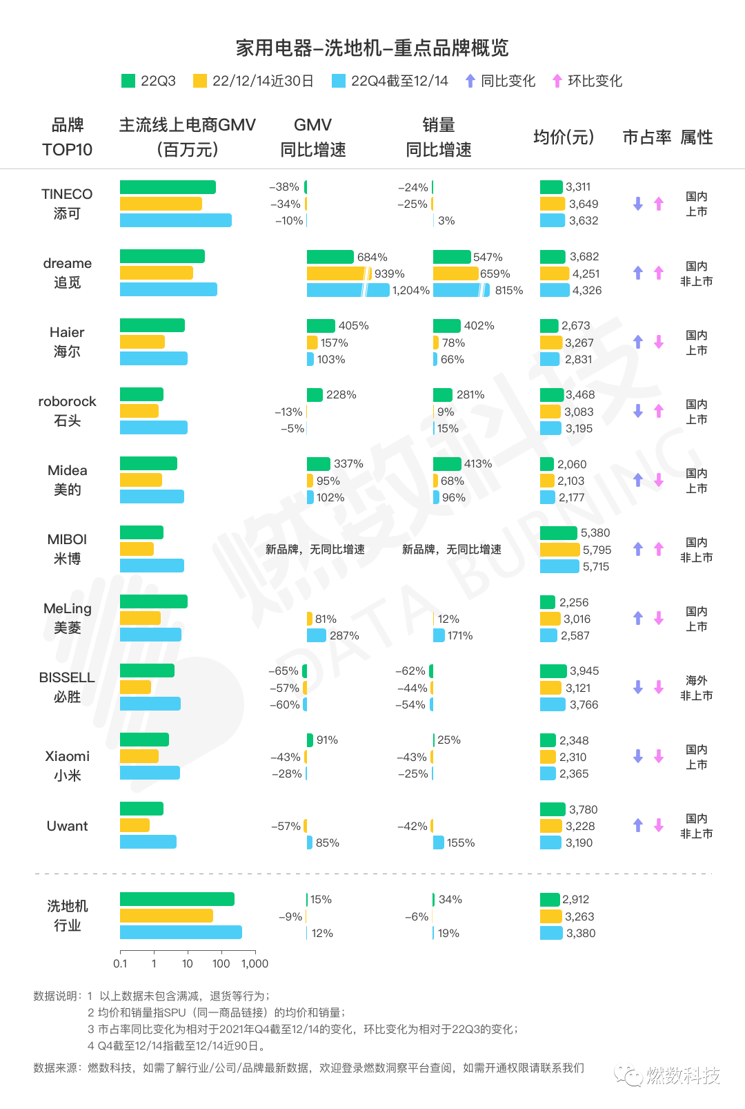 截至12月14日近30日,洗地机行业GMV同比增12%,其中销量同比增19%,反映出均价下探之下该品类触达更多消费人群;