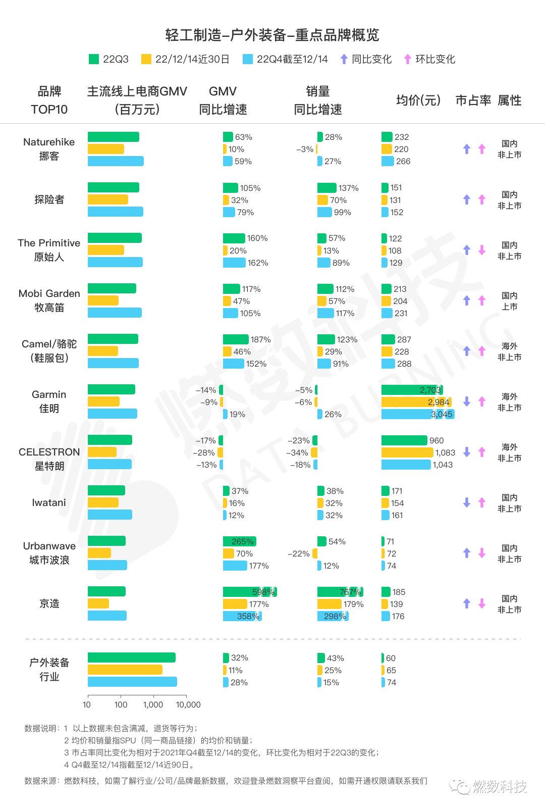 22Q4截至12/14,户外装备行业主流线上GMV增速为28%,延续较高景气度。继11月7日八部门出台《户外运动产业发展规划》,11月21日文旅部再发《关于推进露营旅游休闲健康有序发展指导意见》,行业政策利好信号频出,持续增长可期。