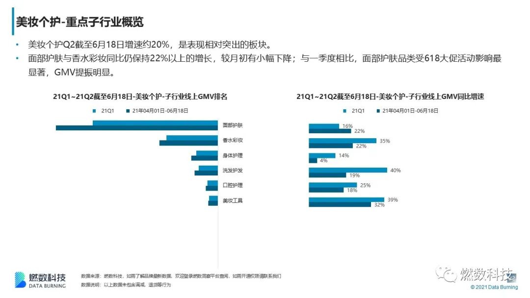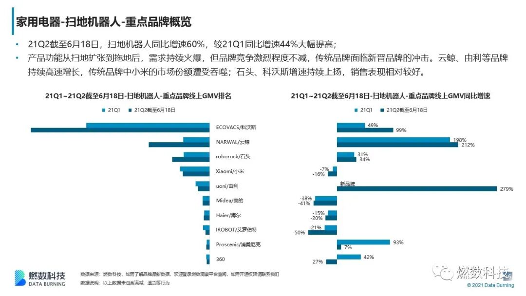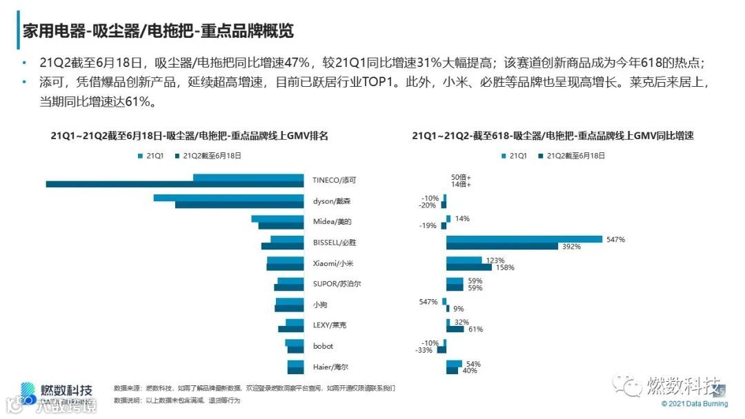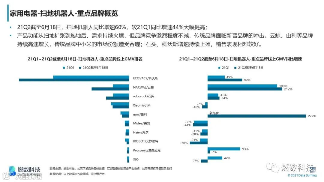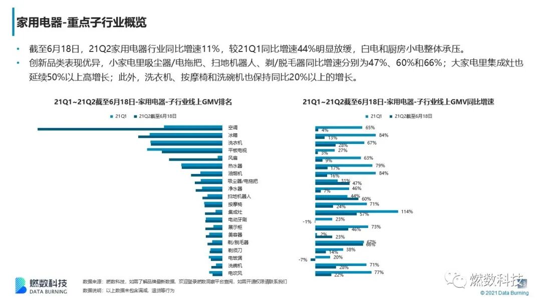 家用电器:线上GMV同比增速11%,创新品类表现良好,活动节效果显著;白电和厨房小电承压;创新品类表现最为突出,吸尘器/电动拖把、扫地机器人等品类在618大促中持续放量,近一期呈现高速增长;消费升级和KOL带货驱动,剃/脱毛仪、美容器等个护品类的重点品牌同样保持高增长,之前火热的按摩椅和集成灶品类增速有所放缓。