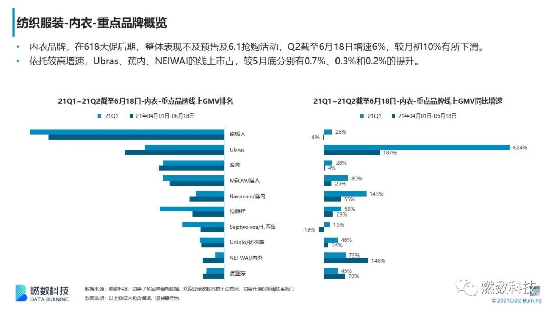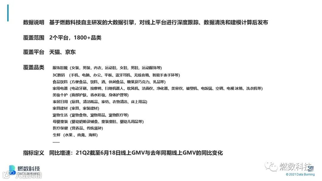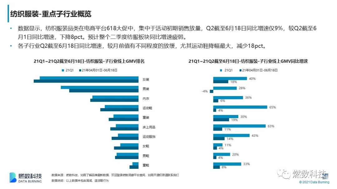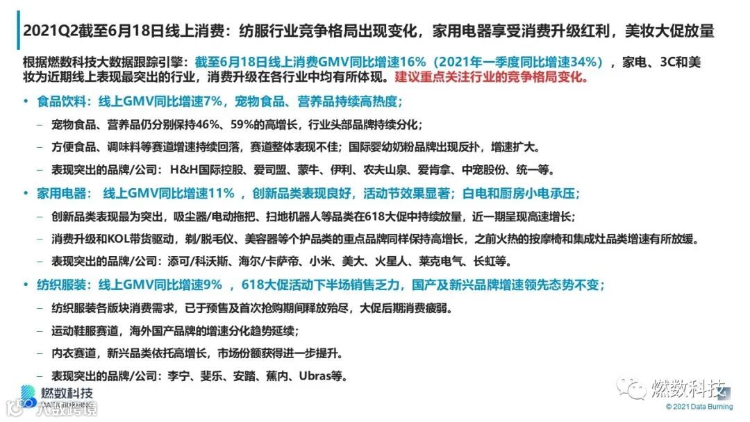 纺织服装:线上GMV同比增速9% ,618大促活动下半场销售乏力,国产及新兴品牌增速领先态势不变;纺织服装各版块消费需求,已于预售及首次抢购期间释放殆尽,大促后期消费疲弱。运动鞋服赛道,海外国产品牌的增速分化趋势延续;内衣赛道,新兴品类依托高增长,市场份额获得进一步提升。
