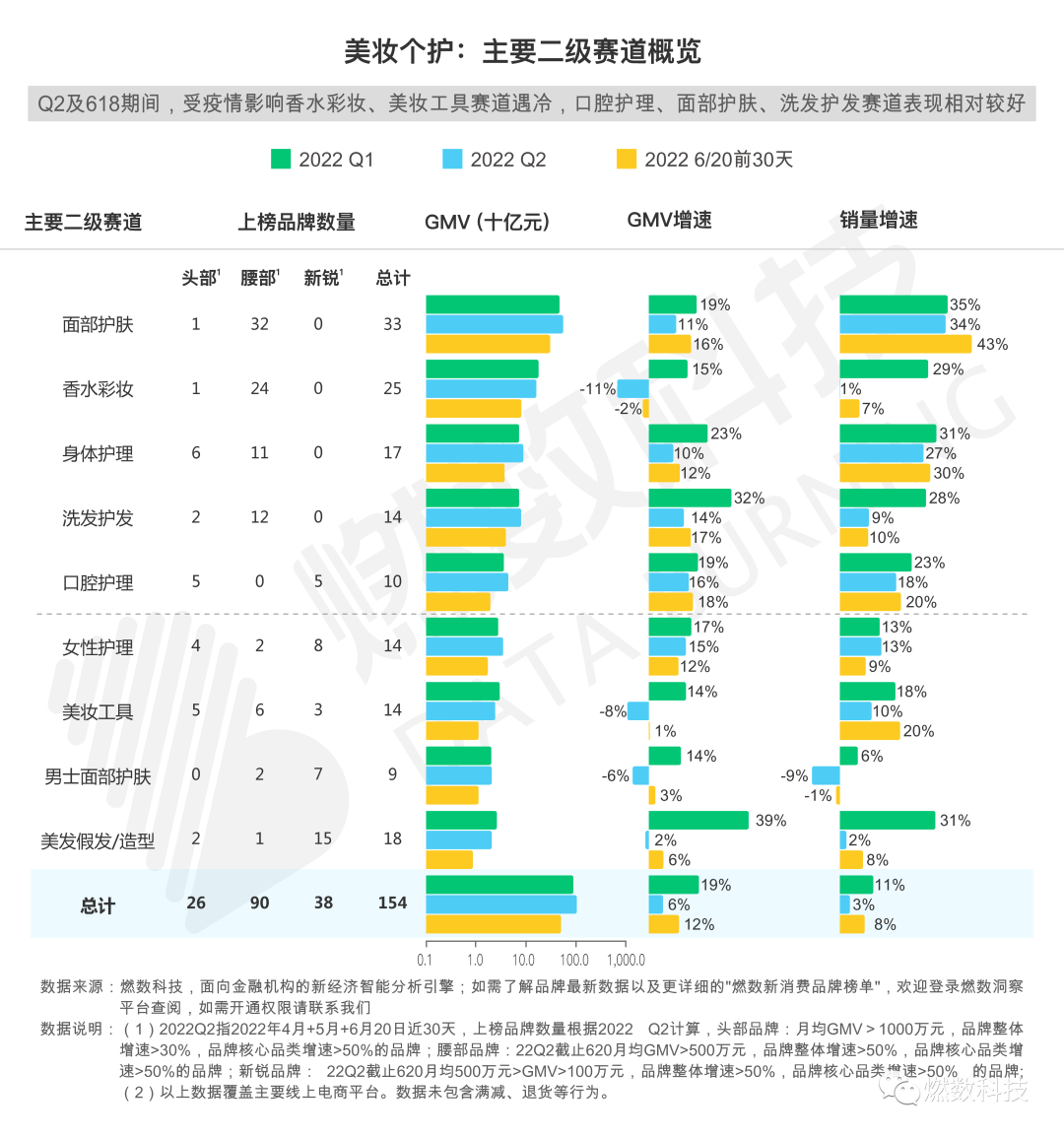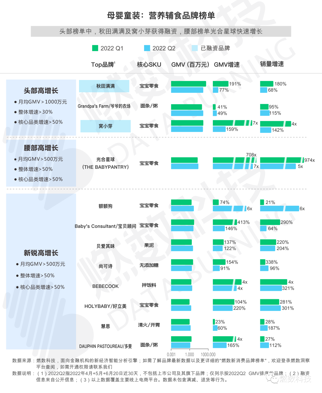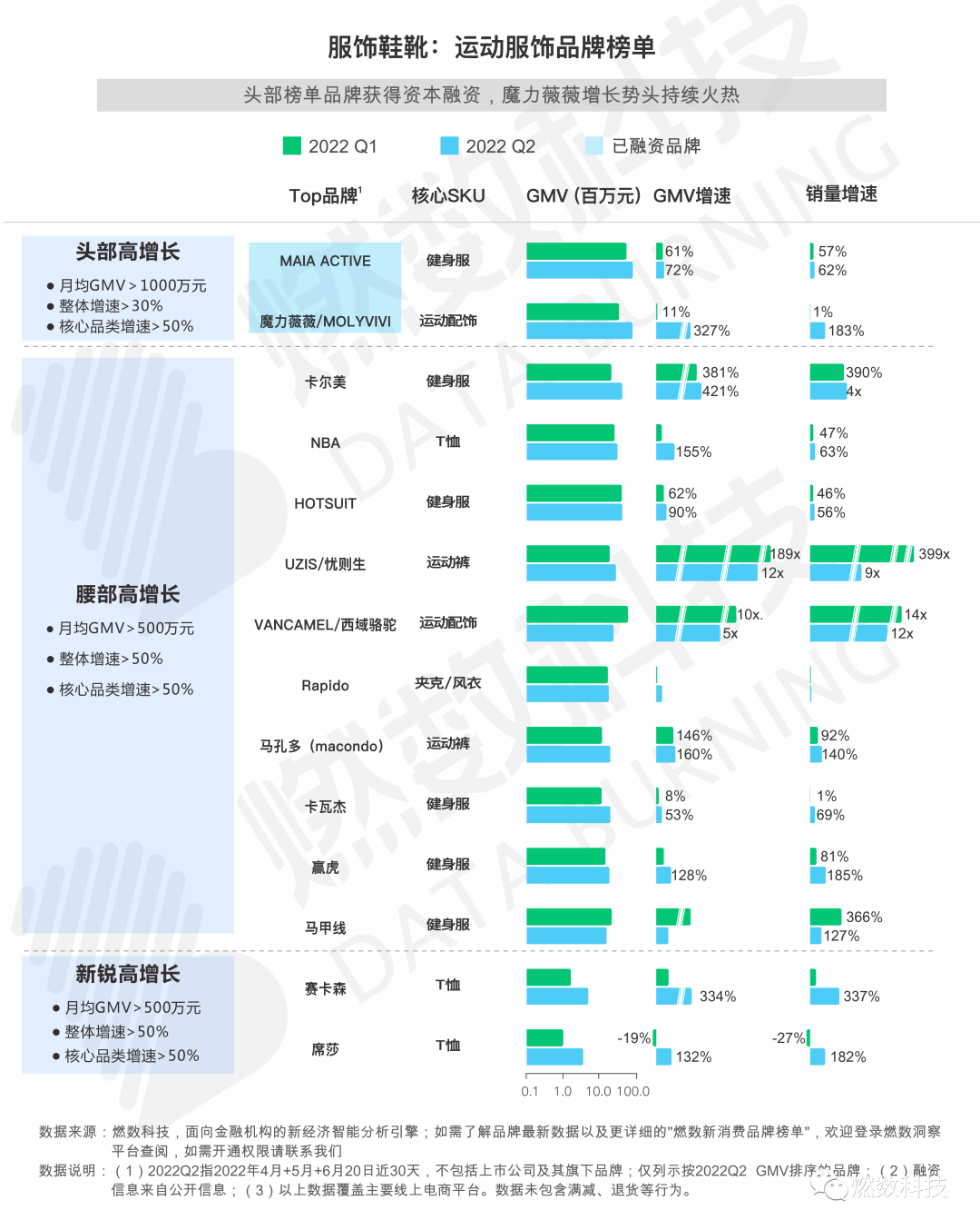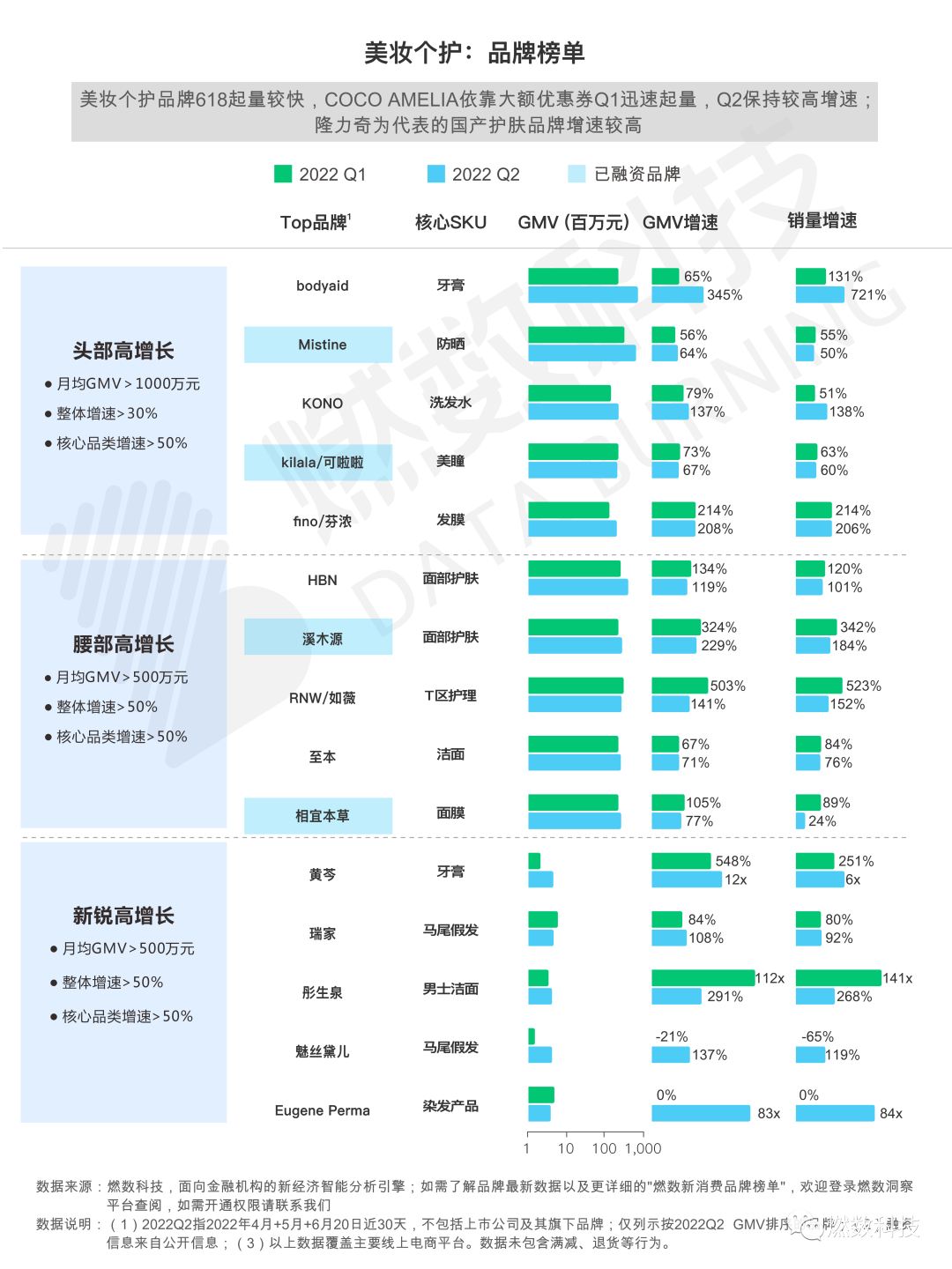 燃数头部品牌上榜条件:22Q2月均GMV>1000万元,品牌整体增速>30%,品牌核心品类增速>50% 的品牌,具体表现如下: