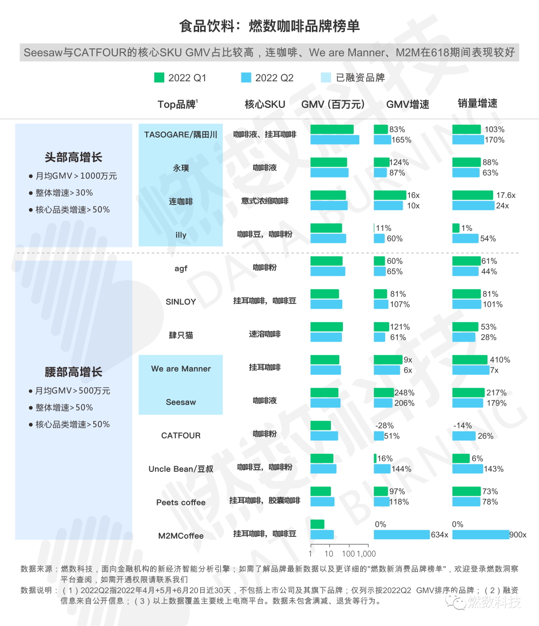 对咖啡品质有更高追求的咖啡重度爱好者,选择精品咖啡豆为主的illy、Uncle Bean、M2M等品牌,Q2 GMV增速分别为60%、144%、600+倍。