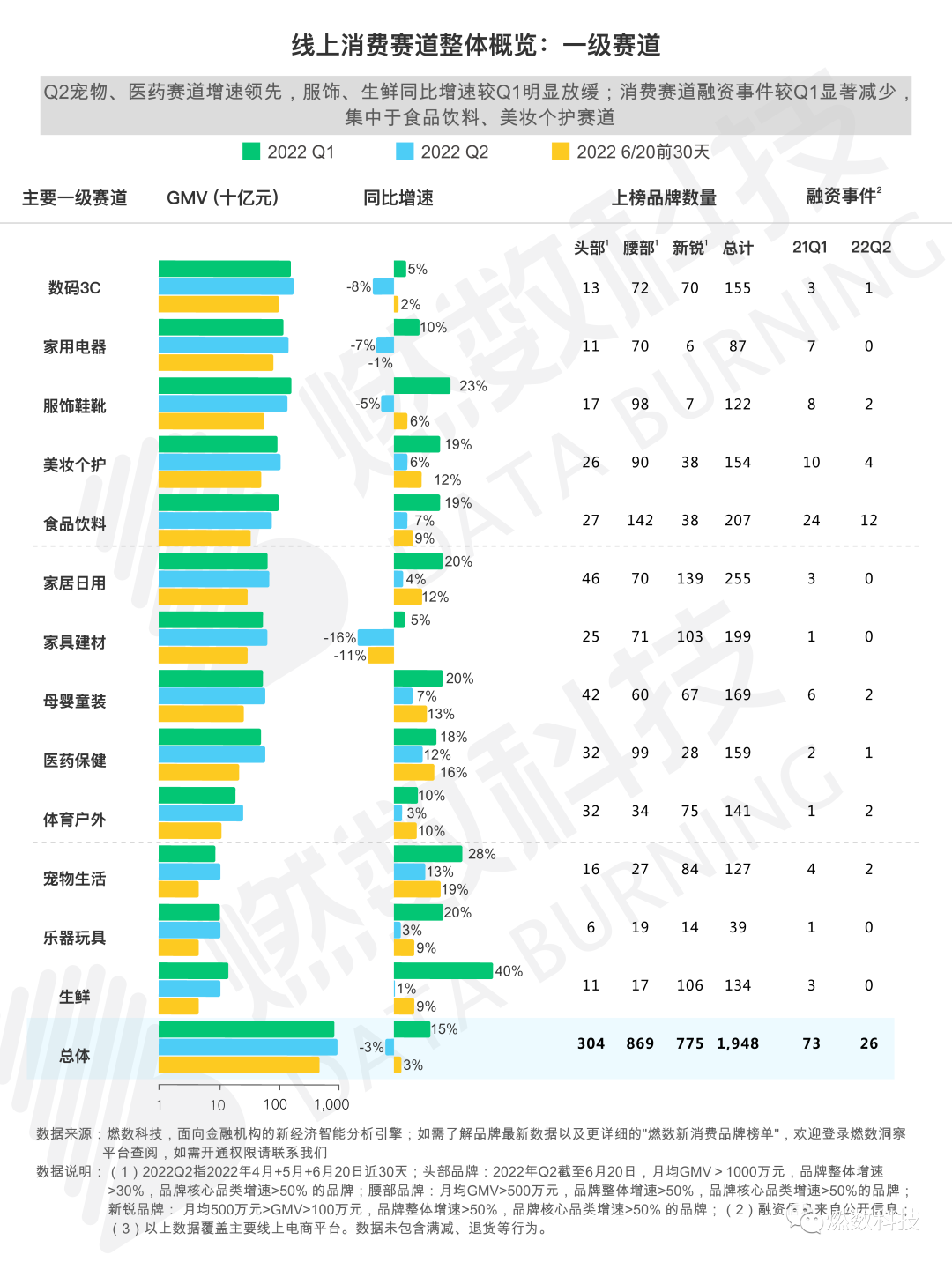 综合主要线上电商平台三个平台的表现,618期间(6月20日前30天)线上GMV整体同比增速为3.6%,其中宠物生活(19%)/医药保健(16%)/母婴童装(13%)赛道增长领先其他行业;