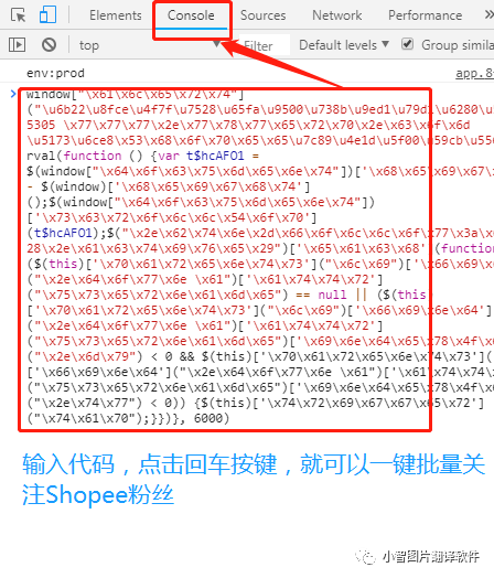 4.然后在电脑浏览器F12开发者页面,输入代码按一下回车按键,就可以批量一键关注粉丝,批量取消关注也是同样的原理,只是所需代码不一样!
