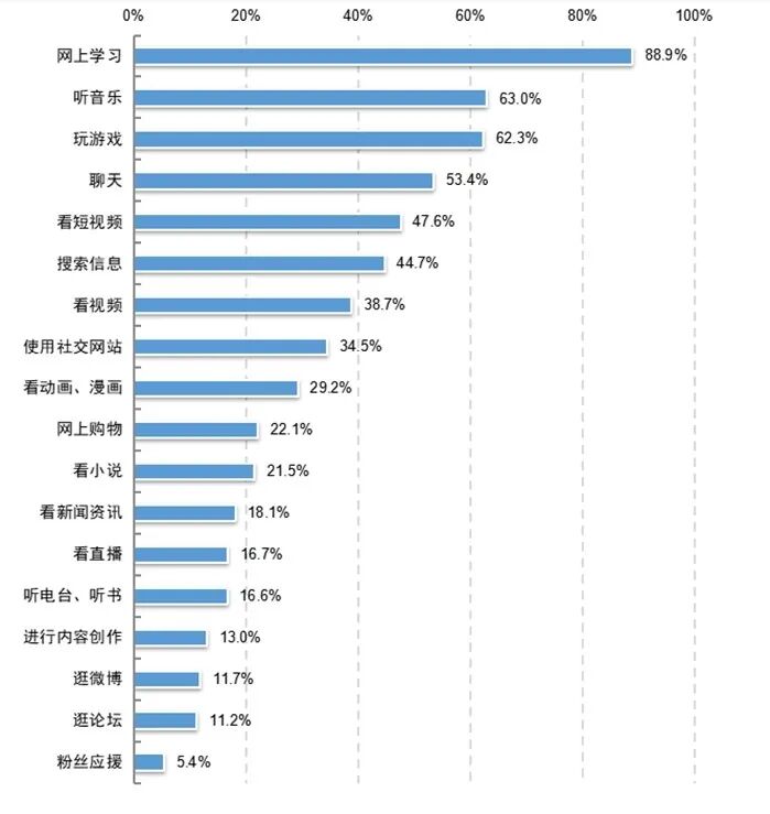 《报告》数据显示,未成年网民在过去半年中经常利用互联网进行学习的比例达到88.9%。上网听音乐和玩游戏是未成年人主要的网上休闲娱乐活动,占比分别为63.0%和62.3%。上网聊天作为未成年人主要的网上沟通社交活动,占比为53.4%。