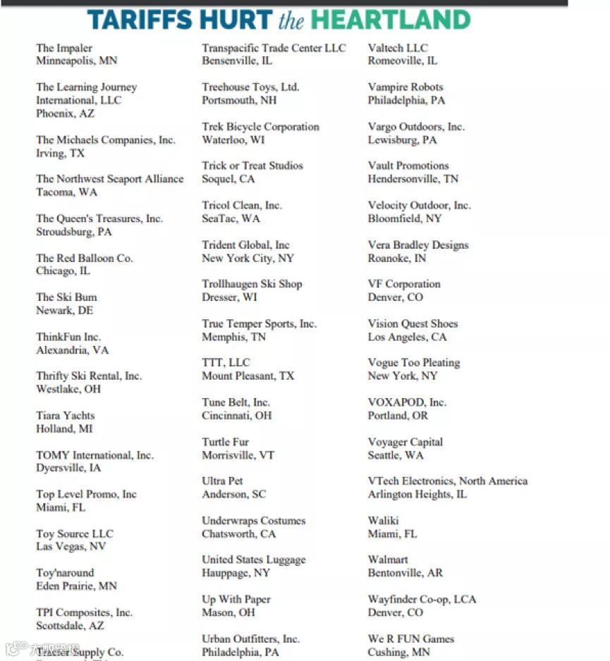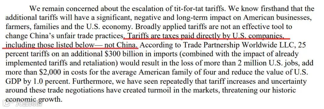“这些关税是直接由美国企业支付的税金,而不是中国”,这些企业在信中写道,“我们深知这些关税将会给美国的企业、农民、家庭以及美国经济带来重大的、负面的长久的冲击”。
